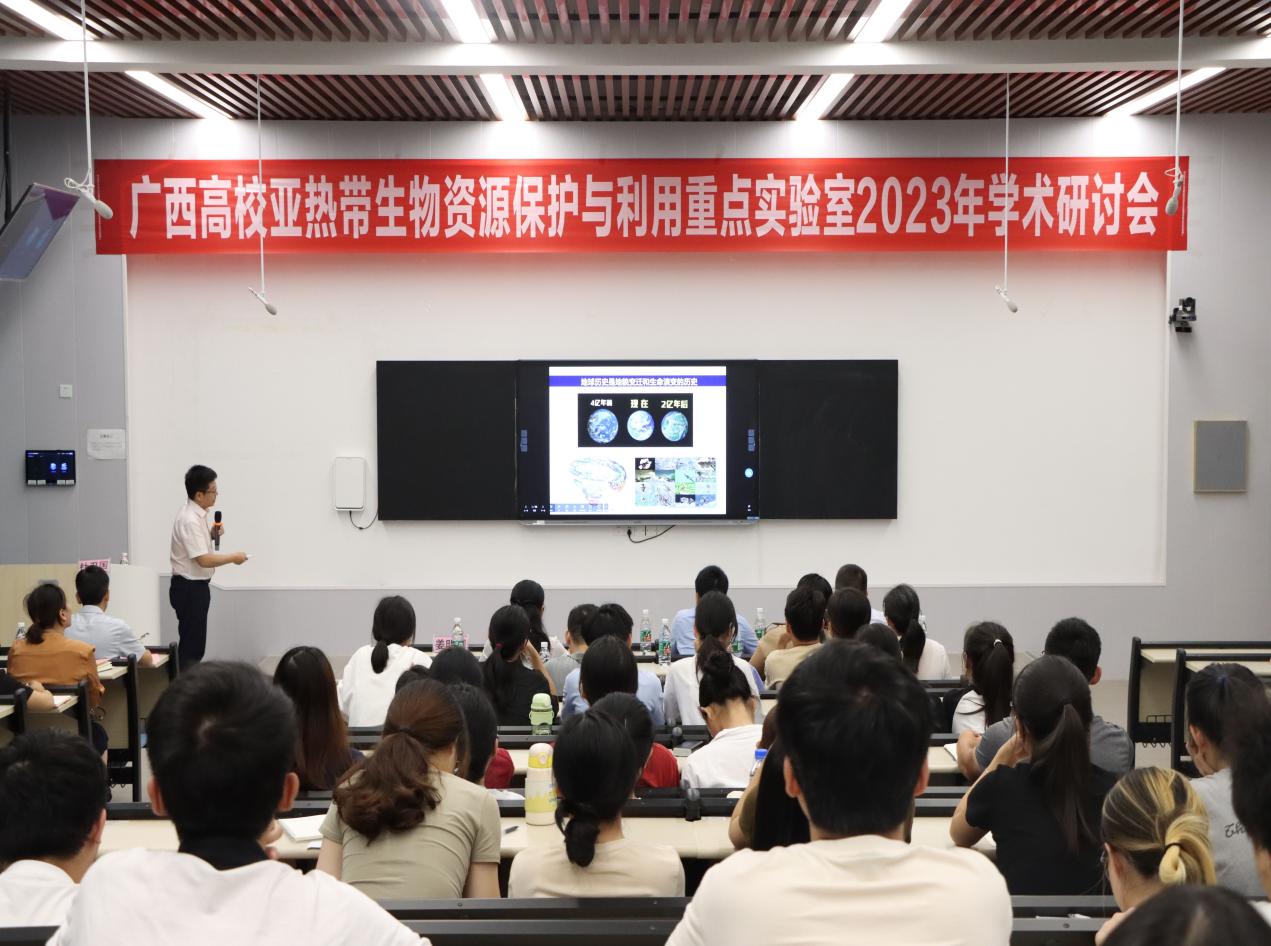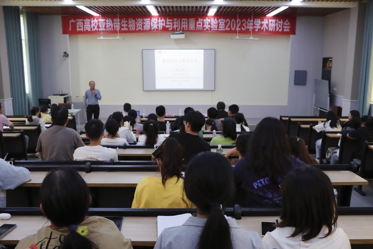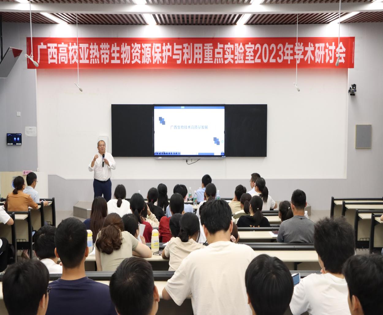 在物理阶梯智慧教室,中国科学院动物研究所杜卫国教授作题为《全球变化背景下的爬行动物保护》的报告。福建农林大学阙友雄教授作题为《甘蔗分子育种的科研实践和理论思考》的报告;湖南科技大学周定港教授作题为《地方院校科研平台申报与建设经验交流》的报告;广西民族大学姜明国教授作题为《广西生物技术高质量发展》的报告。