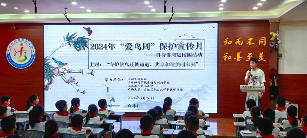 3月26日,德赢赴玉东新区第三小学开展以“守护候鸟迁徙通道,共享和谐美丽家园”为主题的2024年“爱鸟周”保护宣传月科普讲座进校园活动。此活动由玉林市林业局、广西大容山自治区级自然保护区管理处、玉东新区第三小学及德赢共同举办。