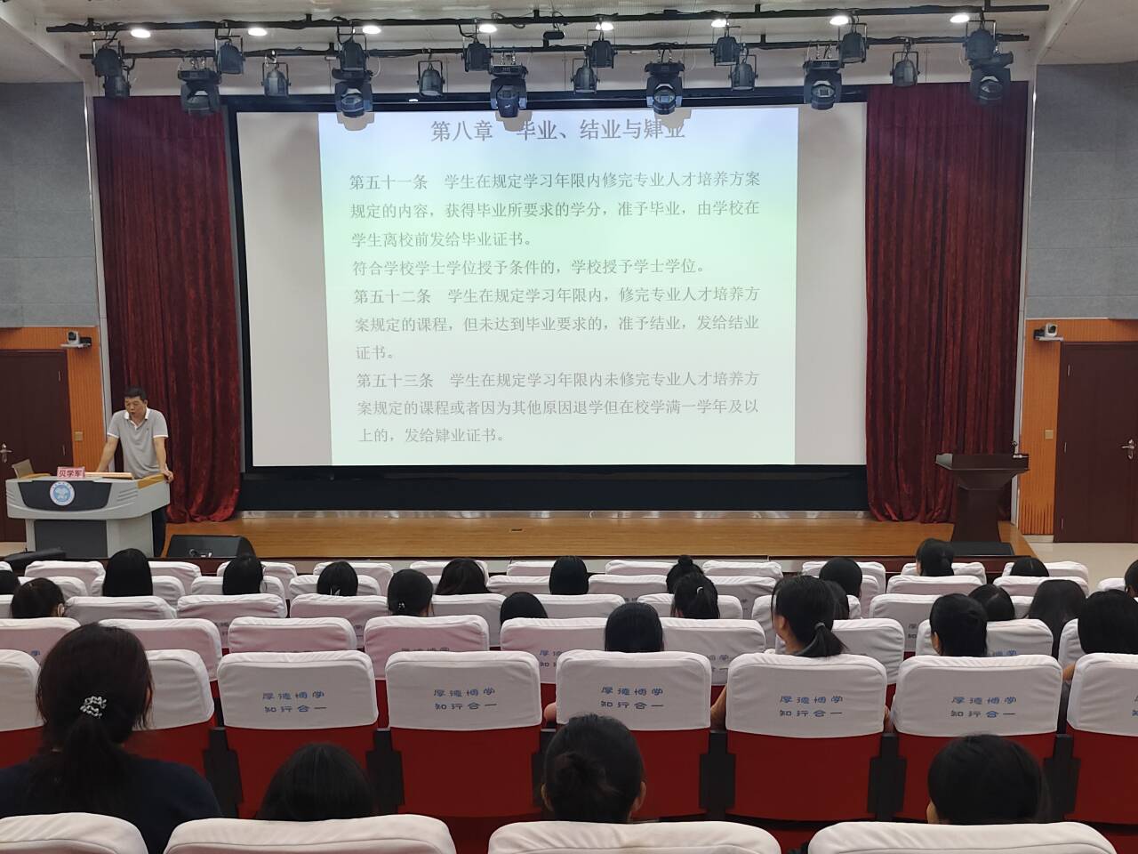 会上,贝学军围绕学校的教学制度这一主题,深入讲解了课程修读、考核标准以及学分绩点等相关内容。他为学生们提供了专业选修课和主修专业课学分获取的宝贵建议,还深入剖析了学院实施学业预警和退学机制的原因,并提醒学生们要防患于未然,避免陷入学业困境。此外,贝学军详细阐述了毕业、结业和肄业三者的不同含义及其在实际应用中的区别。紧接着,他着重介绍了学分制度的重要性,明确了学分在大学生活中的核心地位,并对比了学年制与学分制的本质差异。