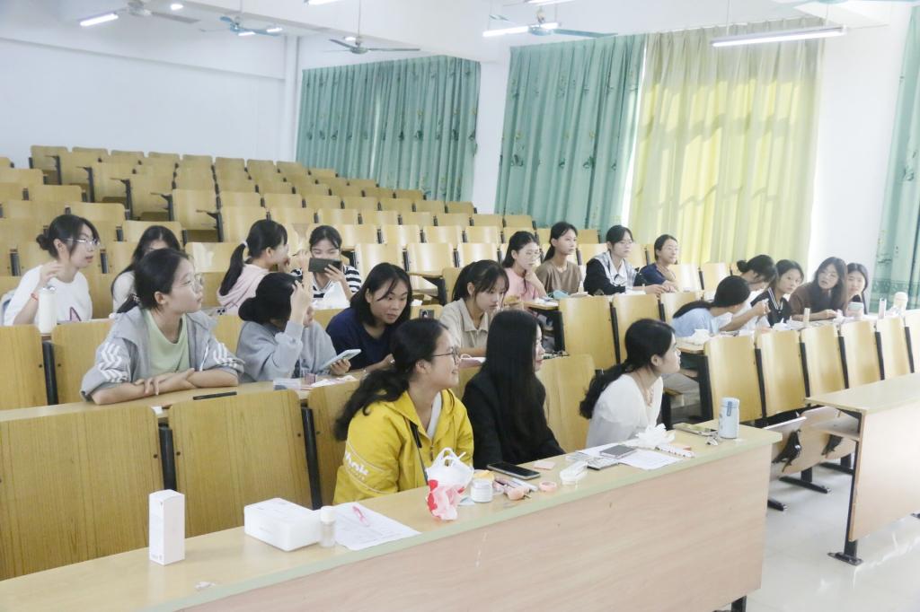 课上,庞钰霞主要就辨别自身肤质,妆前准备,化妆的步骤以及化妆的注意事项等方面进行授课。她指出,学员们应学会判断自身的肤质并根据肤质进行护肤品以及化妆品的选择。她表示,想要取得较良好的修容效果,要注意妆前准备这一步骤,最好提前进行皮肤的补水保湿工作。随后,庞钰霞进行化妆步骤的讲解,并按化妆步骤一一进行示范,进一步指导学员们动手实践,让学员们对化妆步骤有更深的了解,并学会通过化妆扬长避短。课堂接近尾声,庞钰霞跟学员们细致地讲解化妆的各种注意事项,并询问学员们往后是否有想要进行的课程学习,以及感兴趣的课程内容,以便更好地完成琢玉班后续的学习进程。最后,课堂结束,全体成员合影留念。