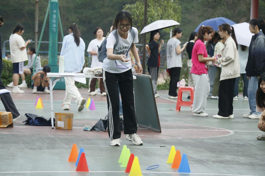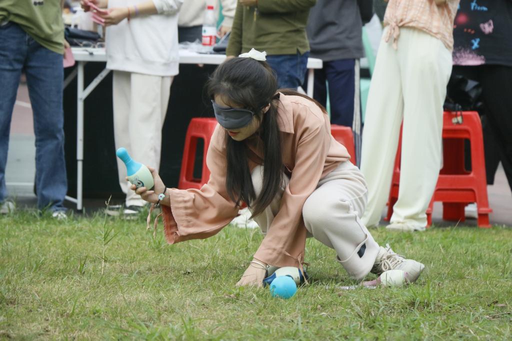 本次活动由“女王赛跑”、“趣味套圈”和“好运我来找”三个游戏组成。在“女王赛跑”游戏中,参赛者们两两配对,背对背夹住气球,随着裁判一声哨响,各组队员迅速起跑。他们默契配合,即使气球不慎掉落也迅速捡起,迅速穿越篮球场,展现出了青春的活力和团队精神。在“趣味套圈”游戏中,参赛者需捏住耳朵原地转三圈后,手持圆环精准抛出。每当圆环正中目标,现场便爆发出阵阵欢呼,学生们纷纷为彼此的精彩表现喝彩。在“好运我来找”游戏中,参赛者两人一组,一人蒙眼原地转三圈后,在同伴的指挥下寻找指定物品。过程中,参赛者们时而小心翼翼,时而大步向前,充满了趣味性和挑战性。