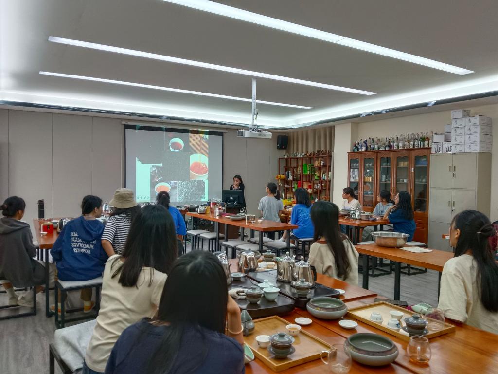 课上,蓝芳美讲解茶的发展历史、“六大茶类”的特点和性质、中国十大名茶及四大产茶区的相关知识,以及茶艺服务中的接待礼仪等。此外,课程还特别安排了实践操作环节,学生们在蓝芳美的指导下,亲手冲泡了花茶、乌龙茶、普洱茶、绿茶和红茶,并进行了茶艺表演。在课堂上,学生们表现出了极高的学习热情和动手能力。他们认真聆听老师的讲解,积极参与实践操作,不断提问和探讨,形成了良好的学习氛围。通过学习和实践,学生们不仅掌握了茶艺的基本知识和技能,还深刻体会到了茶文化的魅力和内涵。