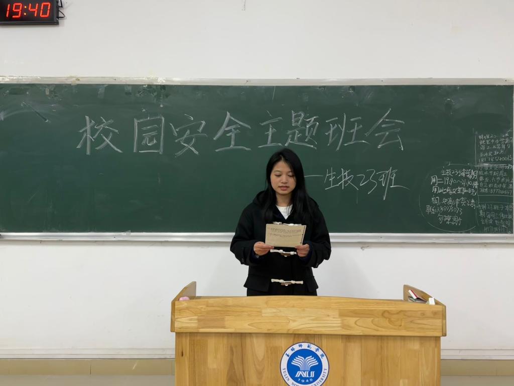 生物科学2023(1)班邱梓萌通过PPT向同学们讲述校园周边存在的安全隐患,并强调同学们在宿舍不得使用功率大的电器以及在校园内严禁骑行“三种车辆”。随后,邱梓萌向同学们讲述《学生手册》中校园安全相关内容,加深同学们们对于校园安全的理解。