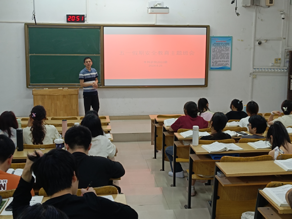 生科定向2022班班主任张克处着重提醒同学们注意五一放假各项事宜。他要求学生们出行谨慎、按时报备、按时返校,并确保安全返校。他强调了电信诈骗和交通安全的注意事项,并呼吁学生们提高警惕,增强个人的安全防范和自我保护意识。针对近期多发的雷雨天气,他特别提醒学生们注意应对台风、雷击、洪水、滑坡、泥石流等自然灾害,并掌握相关的预防知识。